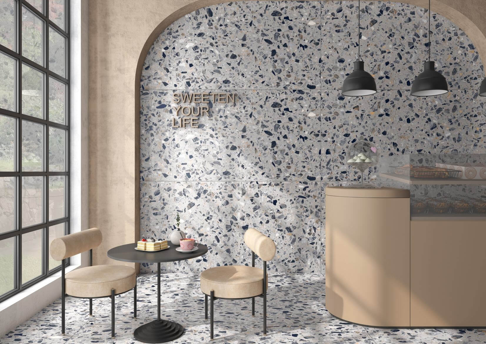 A deep, slate-grey terrazzo tile that combines subtle texture with refined elegance, offering a chic and versatile design.